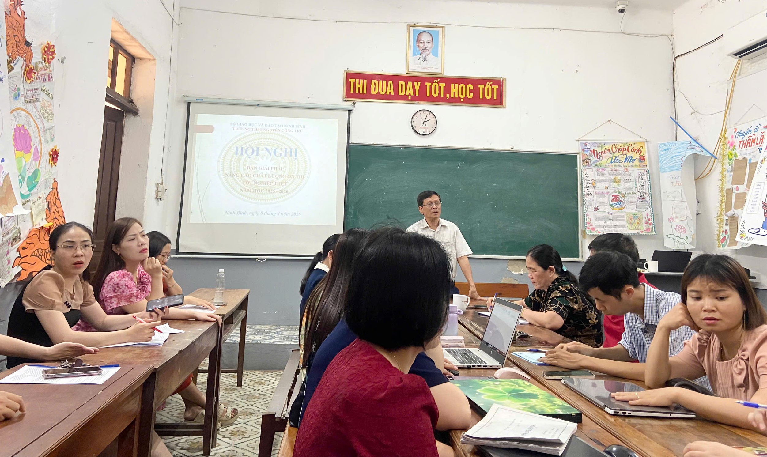 Buổi chiều Nhà trường đã trang trọng tổ chức “Hội nghị nâng cao chất lượng ôn thi tốt nghiệp THPT năm học 2025-2026″ với sự hiện diện đầy đủ của Ban Giám hiệu, các cô giáo chủ nhiệm cùng đội ngũ giáo viên bộ môn khối 12. Phát biểu chỉ đạo Hội nghị Bà Dương Thị Thanh – Bí thư chi bộ – Chủ tịch Hội đồng trường đã nói “ Năm ngoái trường ta đã có sự tiến bộ nhiều so với các năm trước. Thứ tự xếp hạng trong các trường THPT toàn tỉnh Ninh Bình đã có sự cải thiện. Năm nay các học sinh dưới sự chỉ đạo của Ban giám hiệu và sự nỗ lực giảng dạy của các thầy cô đã có sự tiến bộ về điểm số. Chúng ta cố gắng đạt thành tích cao hơn so với năm 2025”.