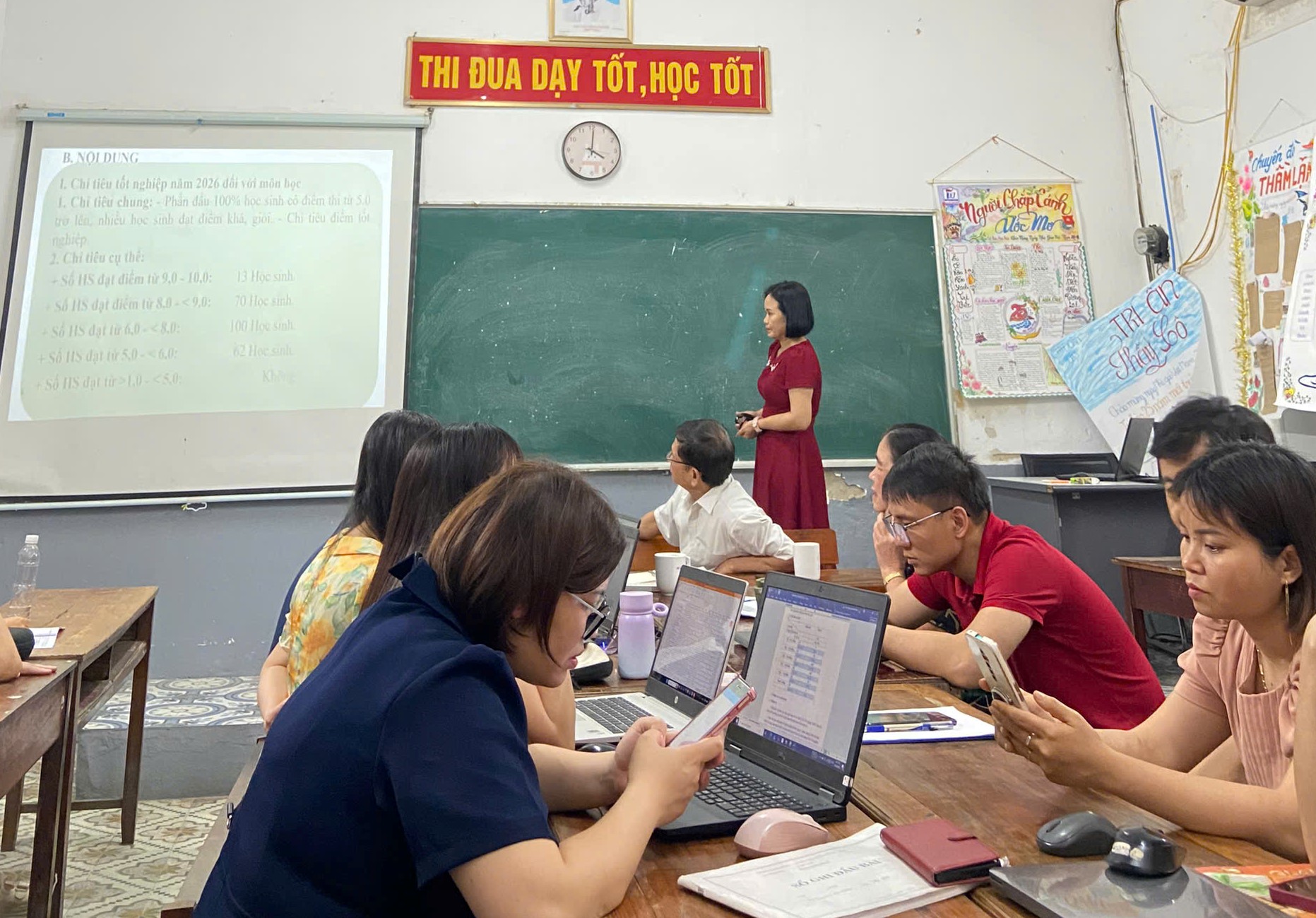 Dưới sự chỉ đạo sâu sát và quyết liệt của thầy Hiệu trưởng Phạm Văn Khanh, Hội nghị đã diễn ra vô cùng sôi nổi và nghiêm túc. Hội nghị tập trung thảo luận những chiến lược thực tế nhằm tối ưu hóa kết quả học tập cho học sinh trong giai đoạn nước rút. Lần lượt các nhóm bộ môn từ Toán, Ngữ văn, Tiếng Anh cho đến Lịch sử, Địa lý, Kinh tế Pháp luật và Vật lý đã trực tiếp lên trình bày những giải pháp chuyên biệt, từ việc hệ thống hóa kiến thức trọng tâm, kỹ năng giải đề đến các phương pháp tâm lý giúp học sinh vững vàng trước kỳ thi. Sự đồng lòng và chuẩn bị chu đáo của tập thể sư phạm nhà trường trong buổi hội nghị không chỉ thể hiện tinh thần trách nhiệm cao cả mà còn là lời khẳng định về sự sẵn sàng, quyết tâm đồng hành cùng các em học sinh chinh phục kỳ thi tốt nghiệp THPT sắp tới với kết quả cao nhất.